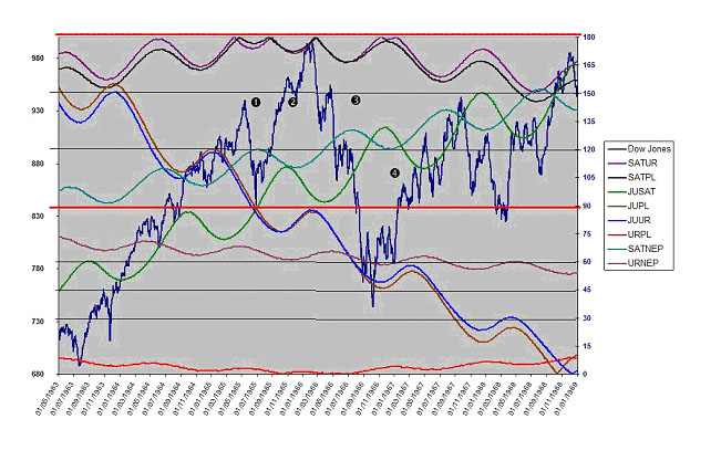 Je vous présente ici les études menées par notre ami Stéphane, financier et technicien de l'astrologie financière, toujours très intéressantes : La période typique Saturne Neptune que nous avons connu depuis Mai 2007, avec de l’inflation, une croissance molle, un choc pétrolier (comme lors de la précédente opposition dans les années 70), l’explosion de la bulle immobilière et une crise financière a dégénéré à l’automne 2008 en crise financière mondiale avec des faillites, des nationalisations spectaculaires et des plans de soutiens au système bancaire sans précédent. Pour être très honnête, l’astrologie permettait d’anticiper une crise boursière du type des années 70, un choc pétrolier, et une période de baisse à l’automne 2008, avec l’arrivée de l’opposition Saturne Uranus, mais plutôt -10% que -20%, et plutôt sur un contexte de récession, typique de Saturne-Uranus, que sur un contexte quasi hystérique de crise financière et économique. Cette intensité dans la chute des marchés, on pouvait l’anticiper pour la mi 2009-mi 2010, on a eu droit à un avant goût un peu plus tôt, parce que le freinage symbolique de Saturne-Uranus a surgit dans un contexte très tendu, et astrologiquement parlant, pour 3 grandes raisons : 1. Une opposition entre deux planètes lentes ne se déclenche dans ses effets que lorsque des planètes rapides en activent les angles, cela a été le cas avec Mars la semaine du 3 au 10 Octobre 2008, qui a activé l’opposition Saturne Uranus. 2. Le stationnement de Pluton tout près du centre galactique, le centre autour duquel tourne notre galaxie. Les passages de planètes lourdes sur cet axe ont souvent été des périodes clefs de l’histoire : pour ne prendre que les passages de Saturne sur l'axe 26,60° Gémeaux/Sagittaire, on trouve : Juillet 1914/Avril 1915, Jan à Oct 29, Sep 43-Mai 44, Mars-Dec 58, Juin -Juillet 73, Dec 87-Oct 88 et Août 2002-Mai 03. Donc: on a vu cet axe touché pendant les deux guerres mondiales, la crise de 29, le 1er choc pétrolier, 2 mois après le crash de 87 et le plus bas de 2000-2003. Convaincant, non ? Il n'y a que 1958 qui ait échappé aux influences négatives. 3. Le resserrement du Carré Uranus Pluton, aperçu pour la dernière fois pendant la dépression des années 30. A l’automne 2008 les inquiétudes sur l’inflation et le choc pétrolier ont disparu, alors que celles sur la récession sont apparues en pleine lumière, signalant que l’époque est maintenant dominée par le cycle Saturne Uranus, un cycle rarement observé dans ses effets sur la bourse moderne (on en a connu deux seulement), encore plus lent que Saturne Neptune (45 ans contre 36 ans), et que certains ont assimilé au cycle économique de long terme, plus connu sous le nom de Kondratieff. Pour les économistes nous serions en phase descendante du cycle long d’ailleurs. Pour se faire une idée de ce qui nous attend, on peut donc essayer de décrypter les deux précédentes oppositions 1965-67 et 1918-20, et d’en tirer des leçons pour celle qui vient. L’opposition Saturne Uranus de 1965-1967 L’opposition s‘est produite de façon exacte à 5 reprises sur 21 mois, entre le 1er avril 65 et le 6 Janvier 67, le DJ passant de 940 à 809 pts, soit au final une « petite baisse » de 16% entre le premier et le dernier aspect exact, mais avec de nombreux retournements de situation. La période voit aussi l’opposition Saturne Pluton se manifester quasiment aux même dates et donc la grande conjonction Uranus-Pluton, ce qui rend cette opposition atypique. On regardera les contextes politiques, économiques et boursiers. Le contexte politique est très agité, ces deux années voient une véritable ébullition, liée à Saturne-Uranus, mais aussi bien sûr à Saturne-Pluton et Uranus-Pluton : 1. Conflits armés et coups d’état : escalade dans la Guerre du Vietnam, très médiatisée, Guerre des 6 jours au Proche Orient, Guerre Indo Pakistanaise (Cachemire), Guerre du Biafra, et Coup d’état des colonels en Grèce. Péronisme en Argentine, intervention US en République Dominicaine, début de la dictature de Somoza au Nicaragua, Suharto prend le pouvoir en Indonésie, Marcos aux philippines, Ceausescu en Roumanie, Mobutu au Zaïre (une belle brochette…). Mort de Che Guevara. o Ebullition africaine : création ou indépendance de pays (Gambie, Tanzanie, Lesotho, Guyana, Botswana), Coups d’état en pagaille (Centrafrique, Haute volta, Ghana, Congo avec Mobutu, Nigéria, Burundi, Ouganda, Togo, Sierra Leone, Bénin, guérilla en Namibie !), et Guerres civiles (Congo Léopoldville, Rhodésie, Tchad). 2. Changements de société et mouvements d’émancipation /protestation/ oppression : Campagne de Martin Luther King pour le droit de vote dans le Sud américain, assassinat de Malcom X, création des Black Panthers et du Womens’s lib, création de Medicare aux US, dépénalisation de l’homosexualité au Royaume Uni, légalisation de la pornographie en Suède. Création de la Communauté Européenne, que De Gaulle refuse aux anglais (« l’Angleterre, je la veux toute nue »).Révolution culturelle en Chine, destruction de monuments tibétains. Emeutes raciales aux US, émeutes de protestations contre la guerre du Vietnam qui vont crescendo. 3. Pas de mouvements de grèves majeurs (ça viendra en 1968…), pourtant assez typiques de l’opposition Saturne-Uranus de 1919-20, le contexte économique restant bon, ce qui est là aussi inattendu. La grande conjonction Uranus-Pluton expliquant sans doute cela. Contexte économique Nous nous trouvons pendant les 30 glorieuses, l’économie est en plein croissance, et les années 60 voient la principale économie mondiale, les EU, croître à un rythme soutenu de 7.5% par an en moyenne, en dehors d’une récession en 1960/61. On note une petite baisse de régime en 1967 (+5.7% seulement) mais pas de récession liée à un Saturne Uranus, comme on